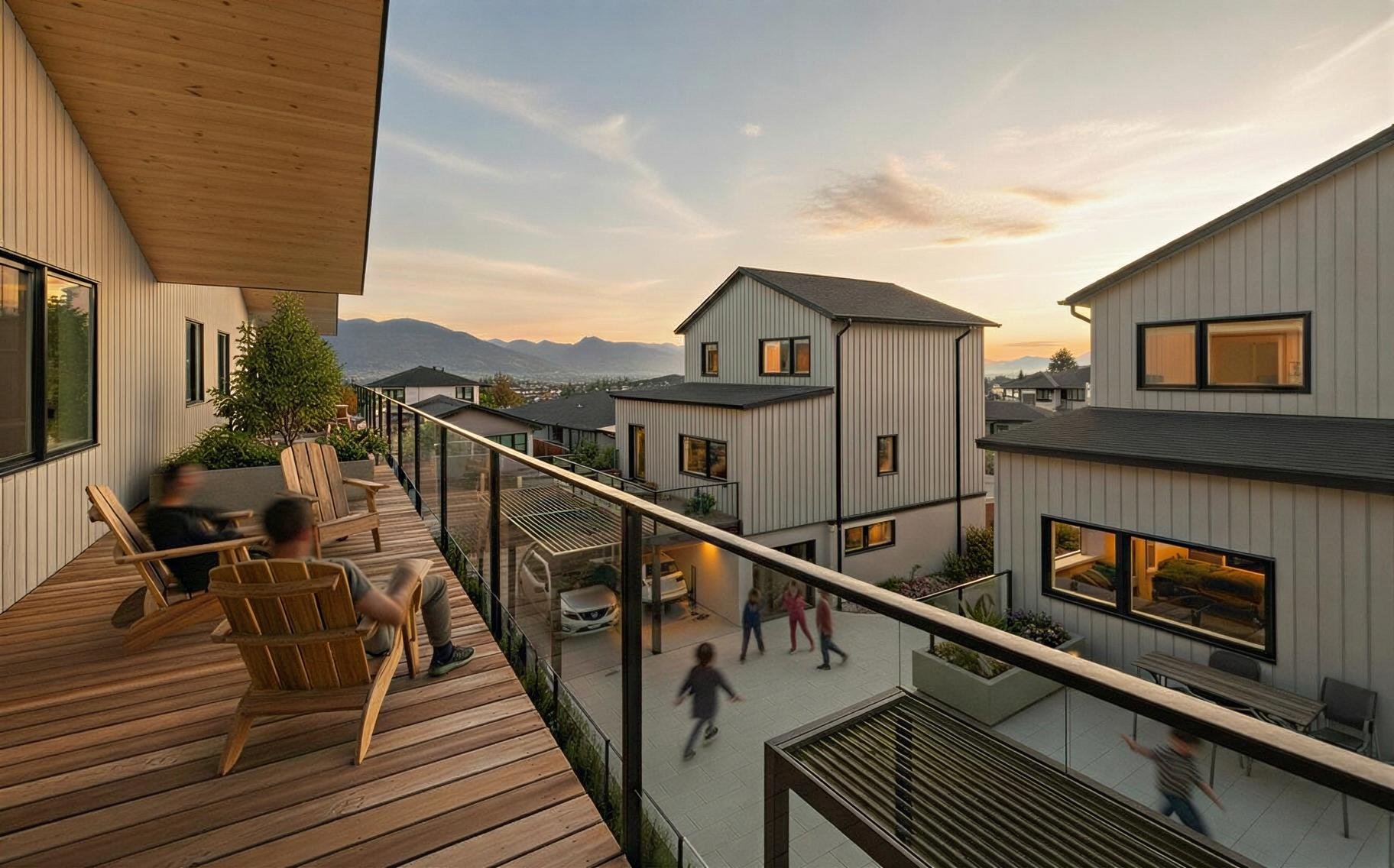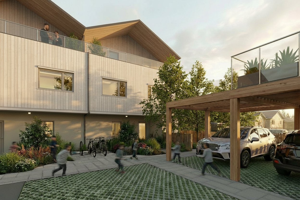CentraLane is a thoughtfully designed multiplex concept for Kelowna, organized around a refined courtyard typology with a central driveway approach. Six generously sized, family-oriented homes are distributed across three distinct buildings, creating a balanced sense of privacy and community. Each residence includes a dedicated parking space, private ground-level outdoor patio space, and expansive upper-level balconies. The design prioritizes livability, efficient site use, and affordable constructability.